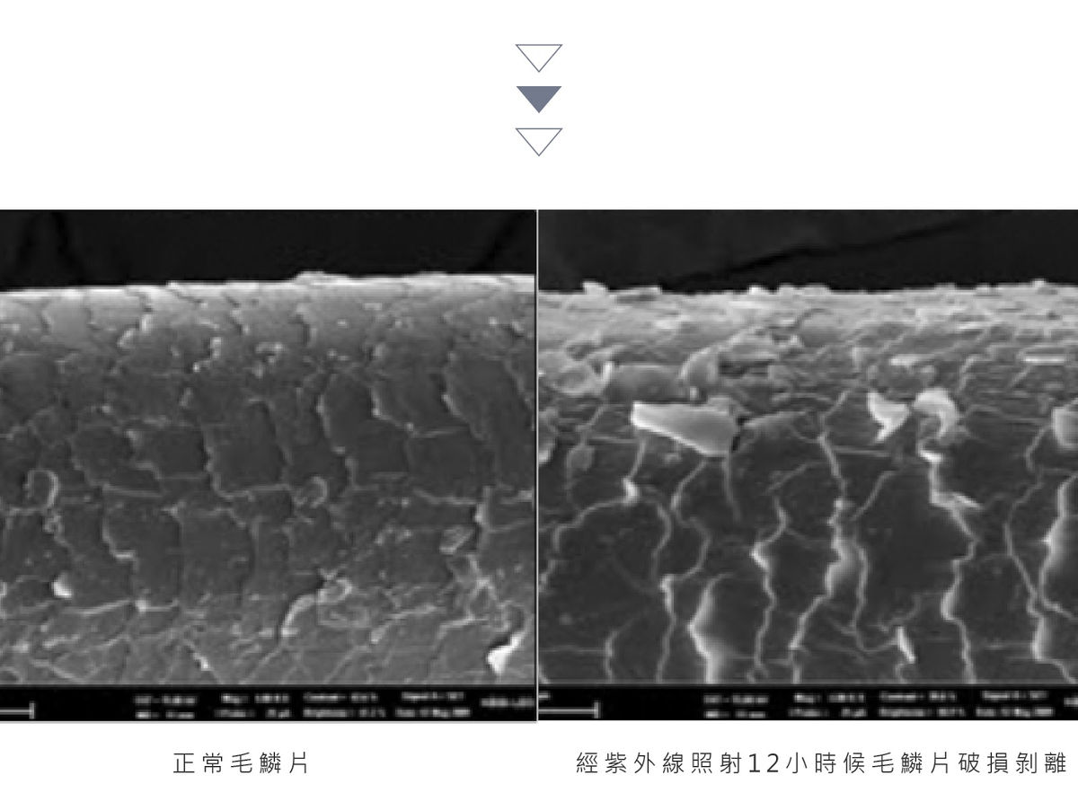 頭髮主要是由蛋白質組成,陽光照射會造成蛋白質的雙硫鍵被破壞,因此毛鱗片(cuticle)會破損粗糙,造成頭髮強韌度下降易斷裂,下圖左側正常頭髮的毛鱗片排列,呈現均勻規則的層狀,右側圖則是用紫外線照射十二個小時後,可以看到毛鱗片破損剝離,露出頭髮內層結構。缺乏毛鱗片保護的頭髮水分容易流失,因此頭髮會粗糙乾燥、髮尾分叉,當然也就沒有光澤。這個效應在高濕度的環境下更容易發生,這也是為什麼很多人去海邊回來都覺得髮質變差的主要原因。