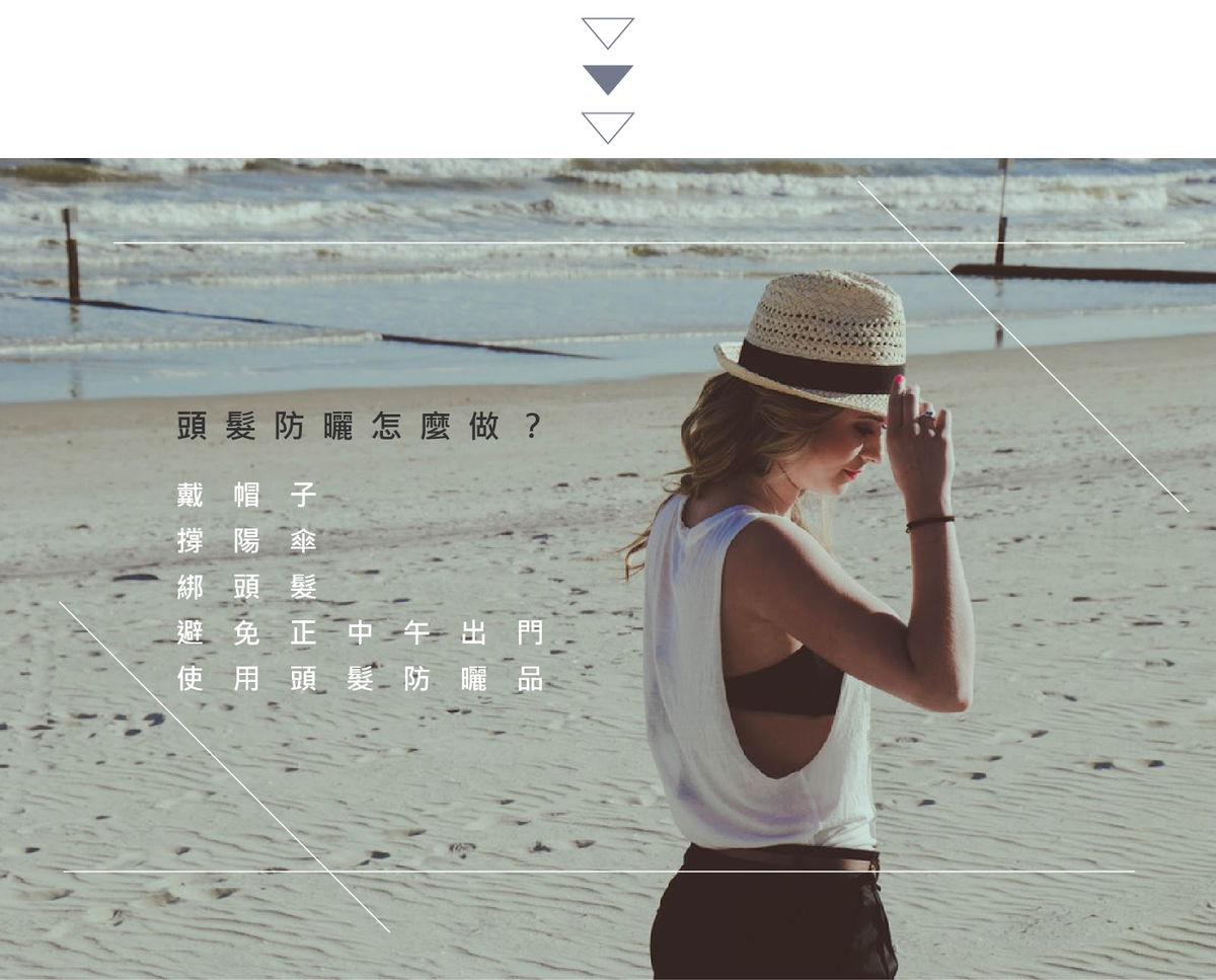 - 最方便有效的方式是戴帽子或是撐傘,不僅可以保護頭髮,也能同時做好臉部防曬,帽子在選擇上可以選帽簷較寬或是有抗UV功效的款式,同時也要兼顧透氣度,避免流汗造成頭皮悶熱,陽傘則要挑選深色有抗UV功效的。